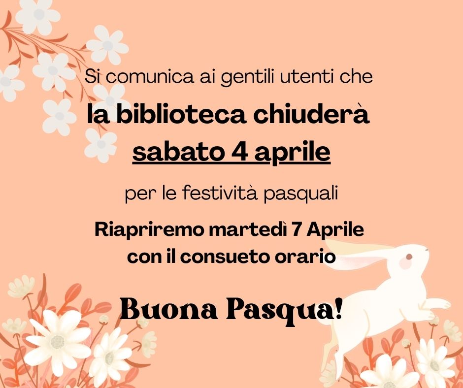 Sabato 4 aprile la biblioteca resterà chiusa; riapertura prevista martedì 7 aprile con il consueto orario.